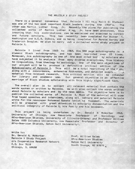The Malcolm X Work Group (MXWG) is part of the CRN. Our efforts are to maintain a critical dialogue between serious students of Malcolm X, to assist in preserving documents and other material, and to publish material including a newsletter. Other CRN work groups exist on the Afro-American Novel, Black Mississippians, and Black Presidential Politics in the South.